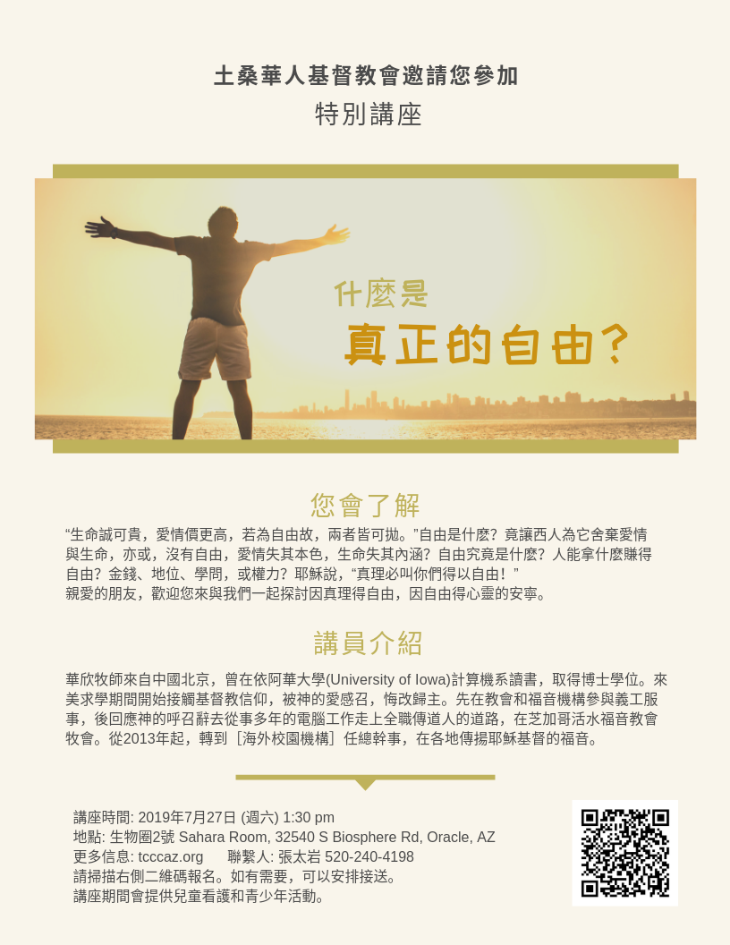 成人講員:華欣牧師來自中國北京,曾在依阿華大學(University of Iowa)計算機系讀書,取得博士學位。來美求學期間開始接觸基督教信仰,被神的愛感召,悔改歸主。先在教會和福音機構參與義工服事,後回應神的呼召辭去從事多年的電腦工作走上全職傳道人的道路,在芝加哥活水福音教會牧會。從2013年起,轉到[海外校園機構]任總幹事,在各地傳揚耶穌基督的福音。